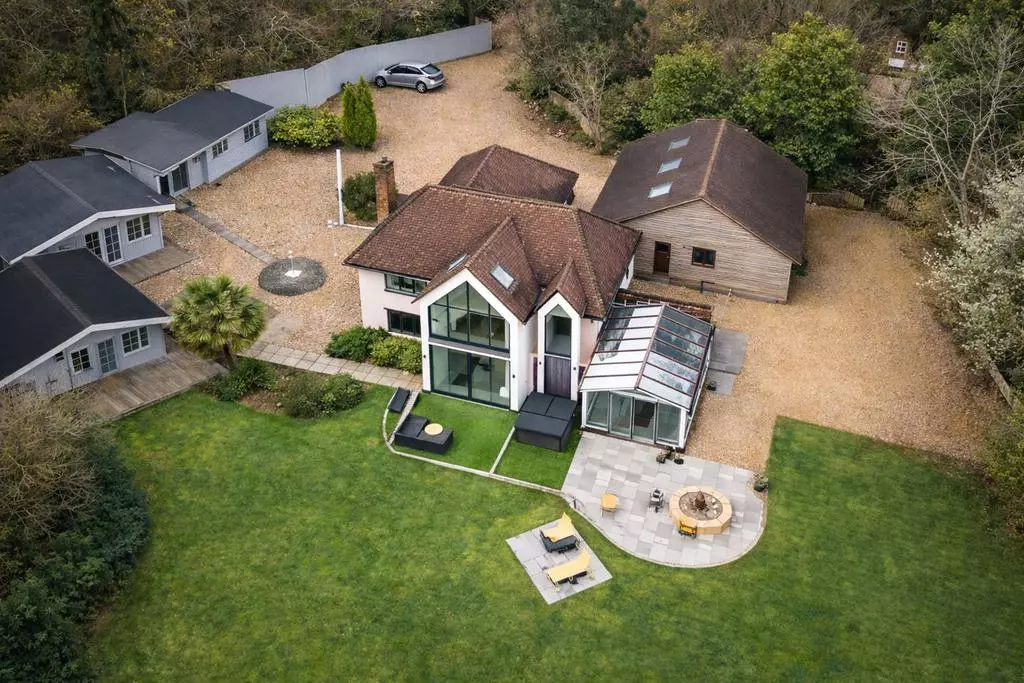 Launch 3D Tour →See how the estate could evolve. You will find an image of the property as it stands today, along with a CGI render showing the cabin converted into a permanent brick-built residence, unlocking a second independent dwelling within the same grounds.